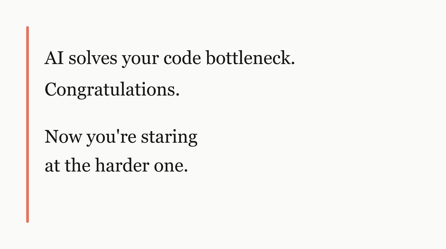 AI is solving the code bottleneck, and it’s surfacing the one that was always underneath. What AI can’t do is look at a problem that crosses three organizations, figure out that nobody owns it, and reshape a team to solve it. That’s the work outside the code. It’s always been leadership work. And it’s about to matter a lot more.